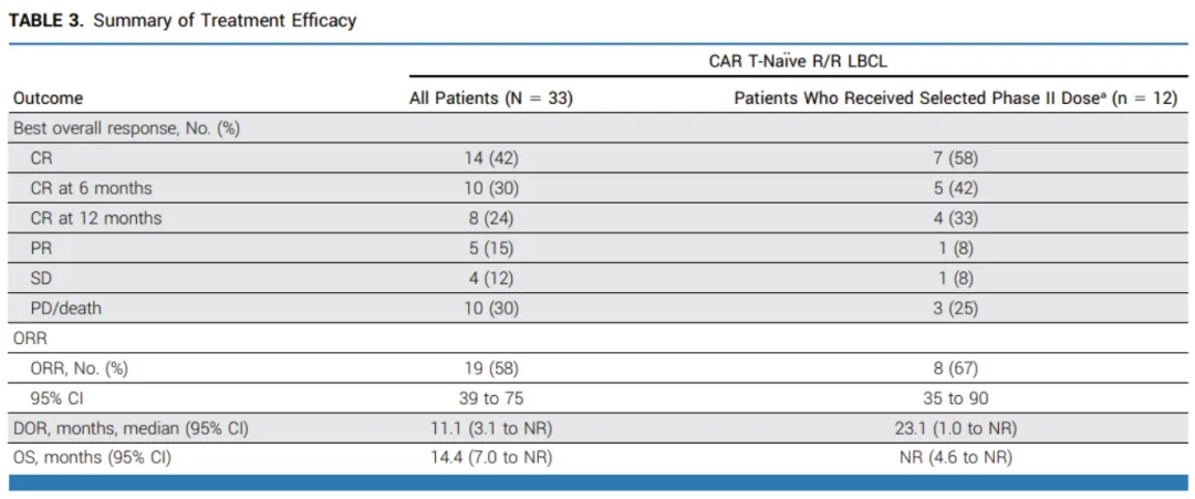 ● 在6×10⁸细胞剂量下,共入组6例患者,4例患者达到疗效评估时间,其中3例达到完全缓解。另有2例DLBCL患者未达疗效评估时间。