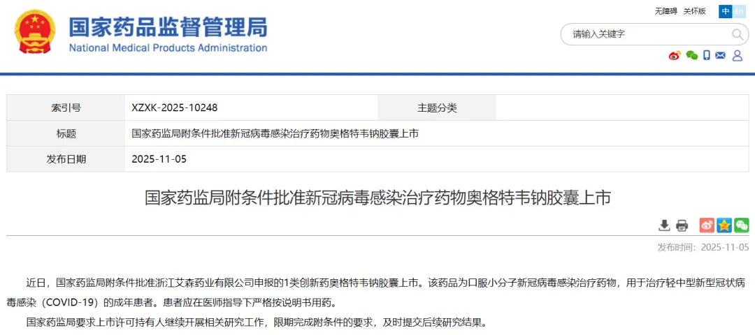 刚刚,国家药监局发布公告,附条件批准浙江艾森药业有限公司申报的1类创新药奥格特韦钠胶囊上市。该药品为口服小分子新冠病毒感染治疗药物,用于治疗轻中型新型冠状病毒感染(COVID-19)的成年患者。