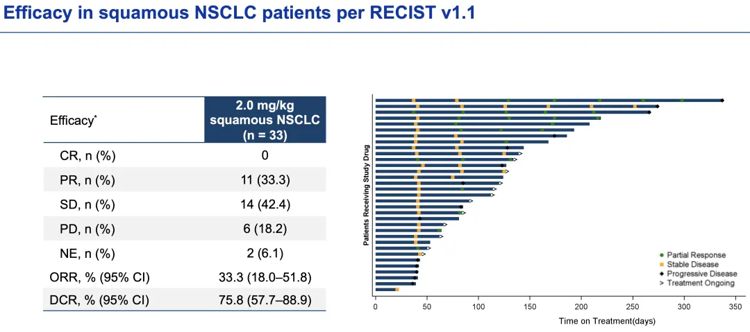 相比WCLC 2025疗效更佳。据山西证券分析,本次数据更新后,2.0mg/kg HLX43(n=33)治疗鳞状NSCLC ORR为33.3%(+4.7pct),其中多西他赛治疗失败的(≥3L,n=13)ORR为38.5%(+8.5pct)。