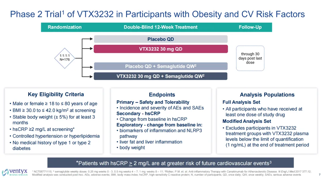 从临床试验设计出发,主要终点是患者的安全性和耐受性,次要终点为hsCRP(超敏C反应蛋白)相较基线的变化,而探索性重点为炎症和NLRP3通路相关生物标志物、肝脏脂肪含量和肝脏炎症、体重指标对于基线的变化。