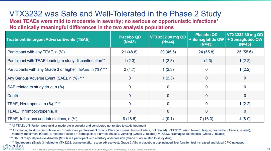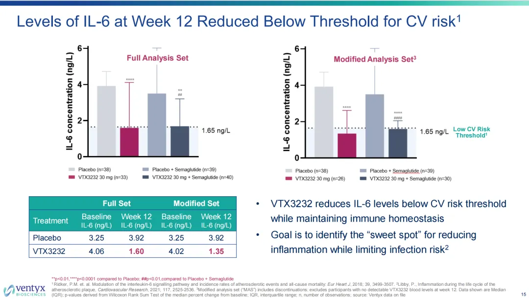 探索性终点值得一提还有IL-6水平的变化,与心血管风险之间存在显著的正相关性(高水平IL-6意味着血管壁正处于持续的炎性状态,可能加速动脉粥样硬化,增加严重心血管事件的风险)。VTX3232的II期研究显示其能够在维持免疫稳态的同时,将IL-6水平降低至心血管风险阈值以下。