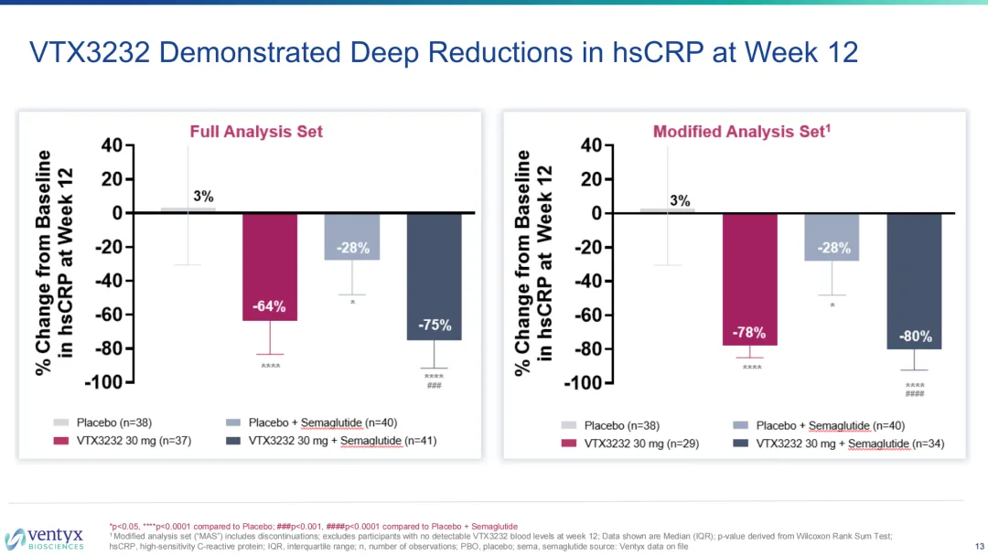 从近期公司股价强劲的背景看,主要的逻辑是VTX3232作为一款安全的NLRP3口服药物,生物标志物(hsCRP、Lp(a)、IL-6)的改善显然是超预期的,这为后续这款药物在心血管领域的开发提供了更多可能性,另外心血管领域专家已普遍认可hsCRP作为风险评估指标(不再是探索性指标),这款药物临床所展现的数据获得专家和投资者的进一步认可。