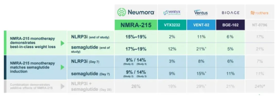 老面孔BioAge Labs同样将自身研发重心转向了NLRP3抑制剂BGE-102,BGE-102在临床前模型中:无论单药还是与GLP-1受体激动剂司美格鲁肽联用,均显示出显著减重效果。公司计划于2026年启动II期肥胖POC研究,顶线数据预计于2026年底发布。