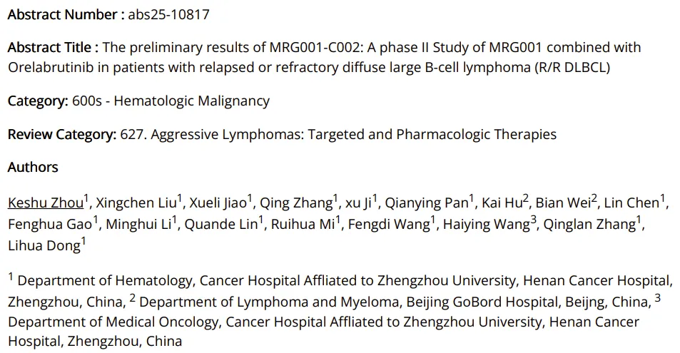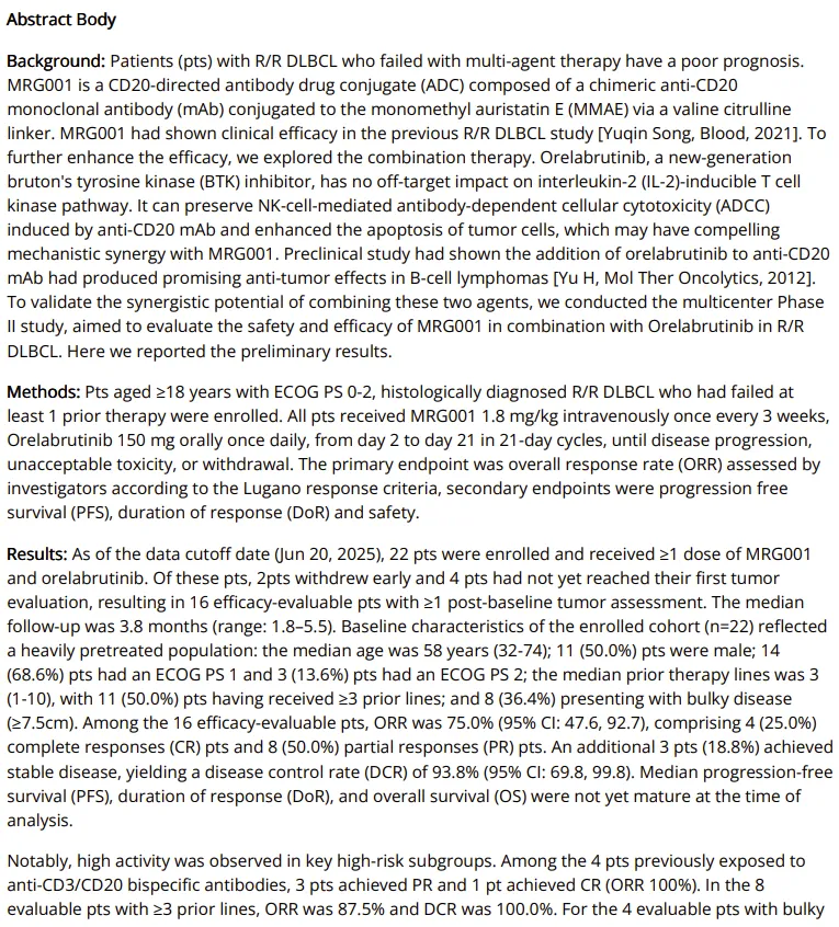 2025年12月6-9日,美国血液学会年会(ASH)将在美国佛罗里达州奥兰多举办,今天ASH摘要正式公开,乐普生物CD20 ADC新药MRG001+BTK抑制剂奥布替尼联合治疗DLBCL的二期临床最新数据将在此次大会上报告。