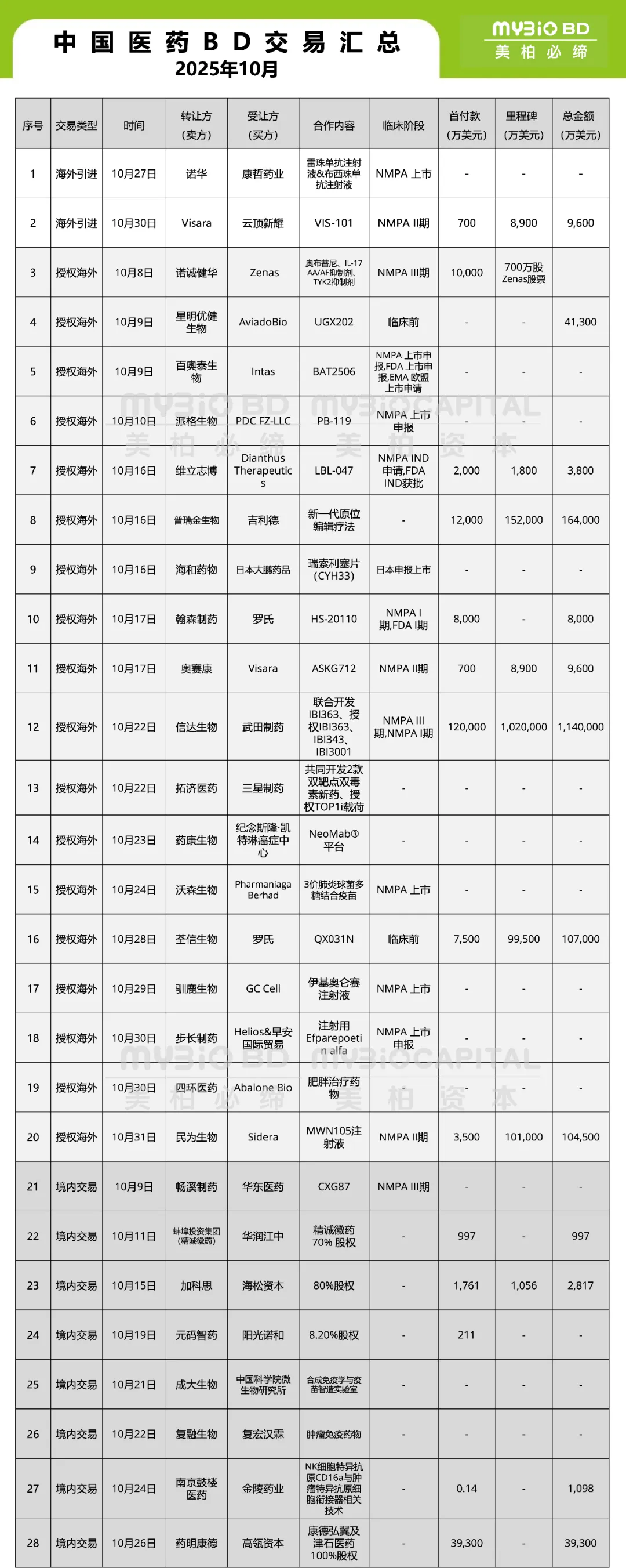 据美柏必缔不完全的统计,2025年10月中国医药BD及并购交易共计28笔,其中跨境资产买入2笔,出海交易18笔,境内交易8笔。