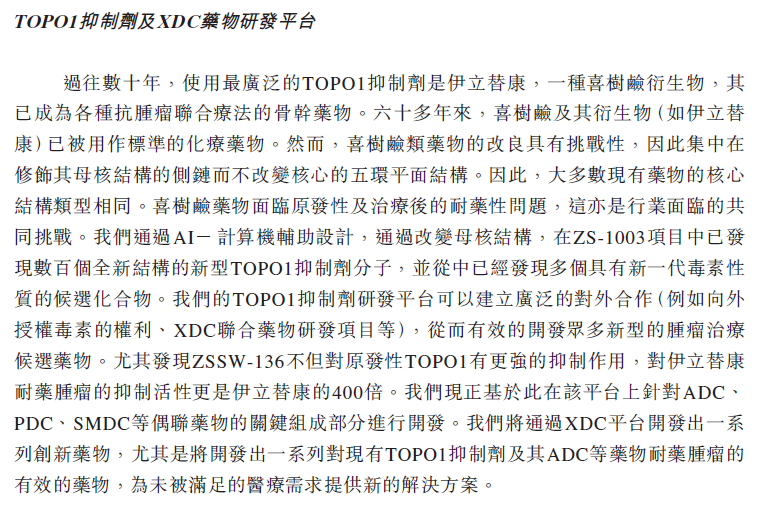 真实生物目前的研发管线以小分子新药为主,但给予TOPO1抑制剂,正在扩展布局XDC药物研发平台,包括ADC、PDC、SMDC等。真实生物认为其ZSSW-136的优势在于不单对原发性TOPO1具有更强的抑制活性,对伊立替康耐药肿瘤的抑制活性是伊立替康的400倍,有望突破显著优TOPO1抑制剂及相关ADC耐药的肿瘤。