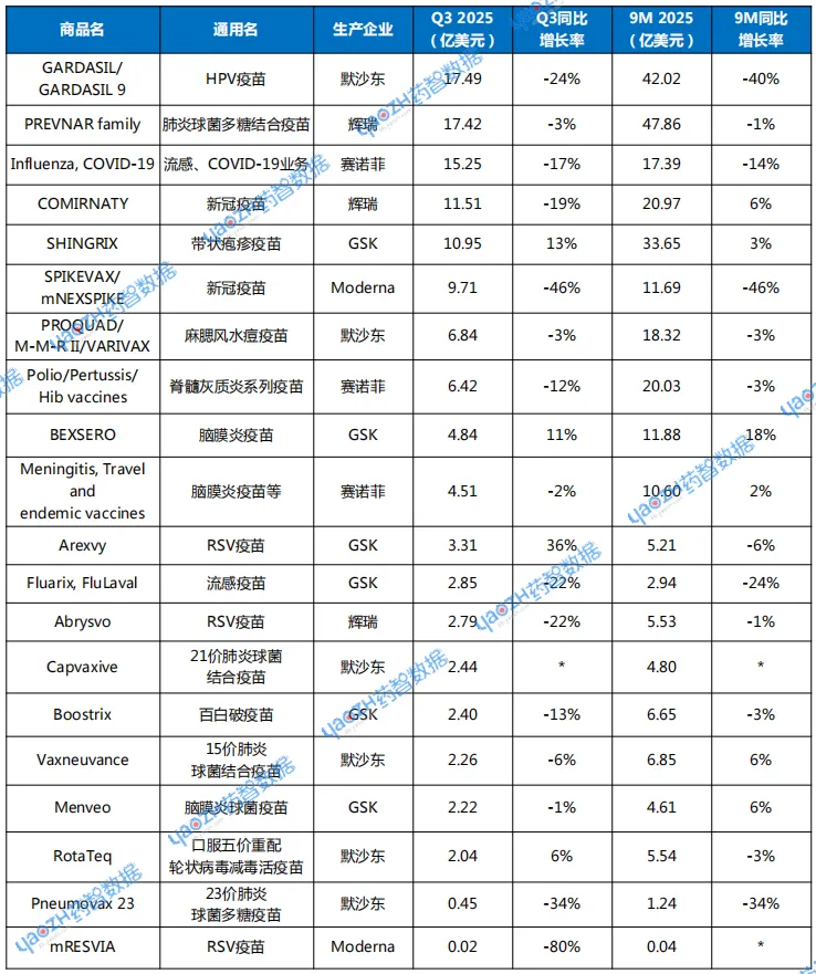 表1 2025Q3主要疫苗产品销售情况