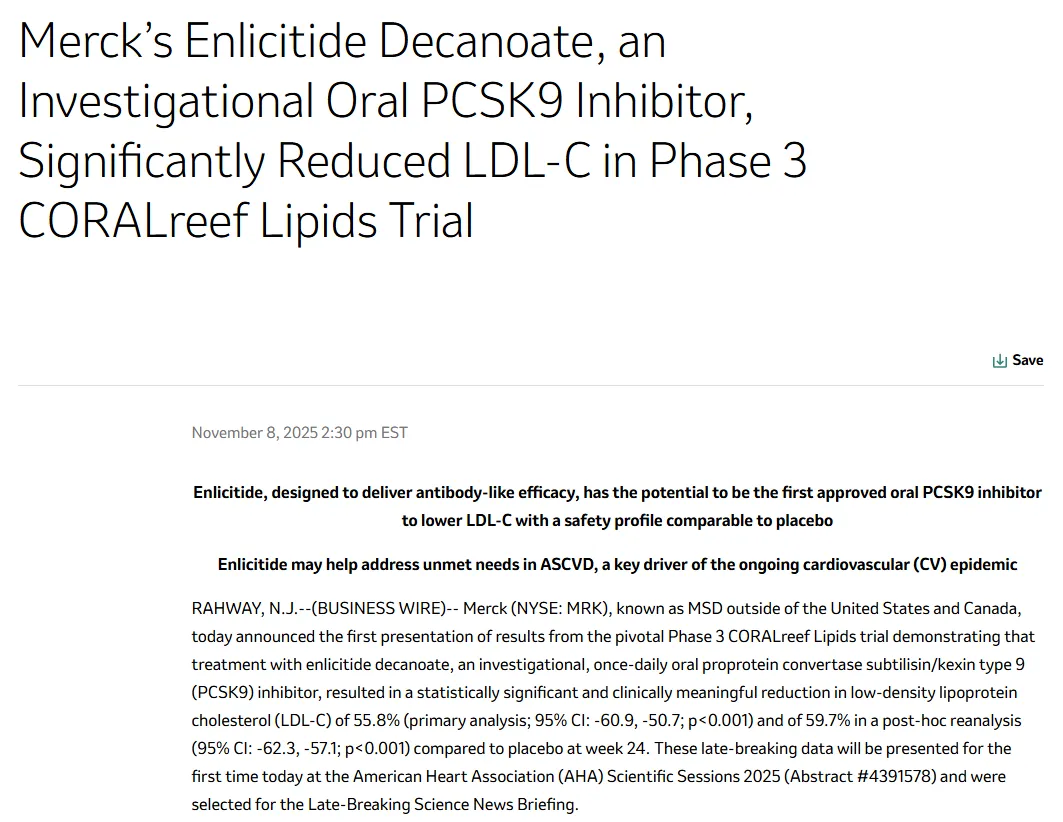 默沙东在AHA年会上公布的两项III期试验数据,充分验证了Enlicitide的强效降脂能力。