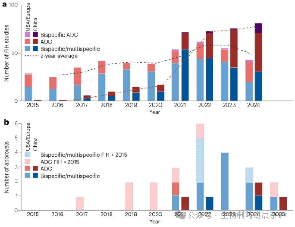 中国,n= 352)并按一般分子类别分类。b:2015–2025年间获批的增强型抗体的首次全球批准趋势a截至2025年9月1日,并按分子来源地区和一般分子类别进行分层。增强型抗体包括双特异性和多特异性抗体、双特异性免疫偶联物、抗体-药物偶联物(ADCs)及双特异性ADCs。欧洲地区包括欧洲经济区国家、英国和瑞士。