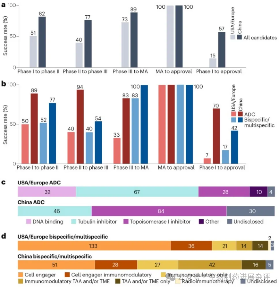 此外,ADC载荷的分布显示,与美国或欧洲公司研发的ADC相比,中国ADC中缺乏成熟的DNA结合型载荷,而较新型的拓扑异构酶I抑制剂载荷占比较高(图2c)。此外,双特异性与多特异性抗体的总体作用机制分布存在差异:一方面是不具备免疫调节特性的成熟细胞衔接器(美国和欧洲公司开发的分子中占59%,中国公司开发的占30%),另一方面是兼具免疫调节特性且靶向肿瘤相关抗原和/或肿瘤微环境的创新型双特异性与多特异性抗体(中国占25%,美国或欧洲占6%)(图2d)。中国原研增强型抗体药物在临床阶段转化率高于欧美企业,可能与其在有效载荷、作用机制和分子结构上的差异有关。