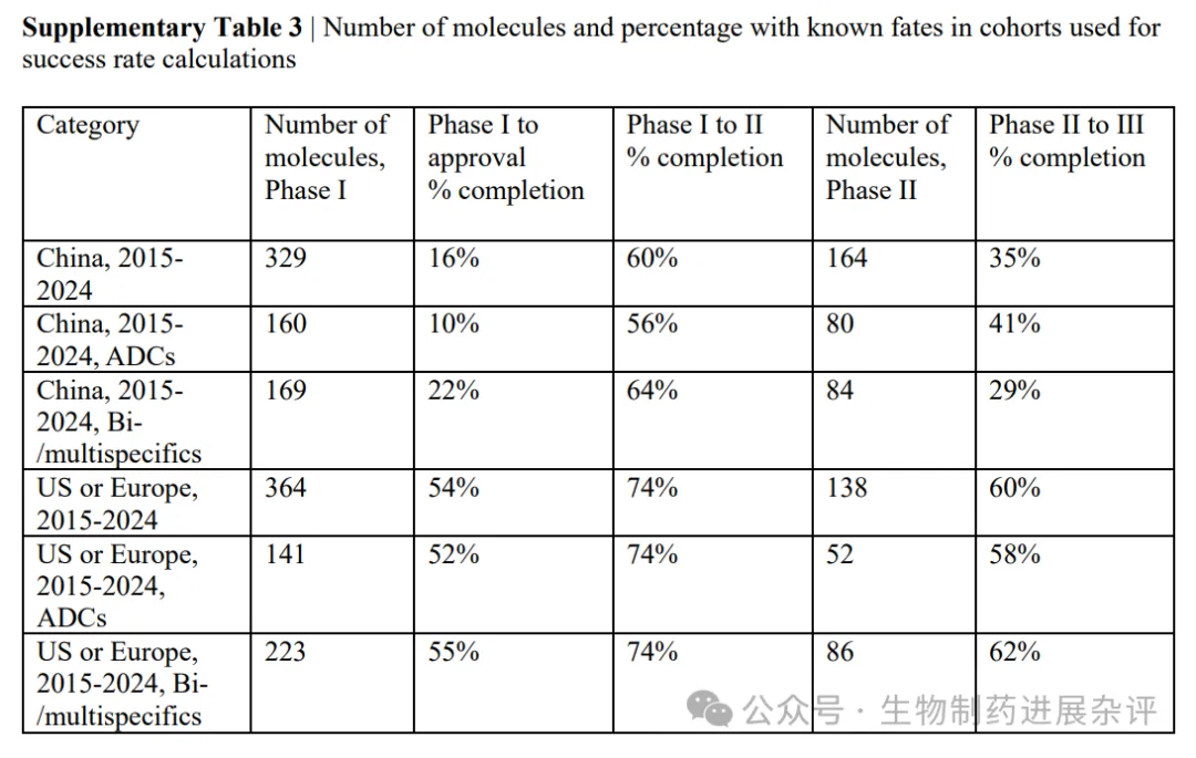 我们计算了增强型抗体疗法的临床阶段转化率和审批成功率,重点分析了抗癌疗法,因为数据集中近90%的分子针对癌症且不同治疗领域的成功率存在差异。研究结果仅为初步结论——由于中国原创开发的分子大多在2020–2024年间进入临床研究,目前大多数分子尚未确定最终结局(获批或终止)。