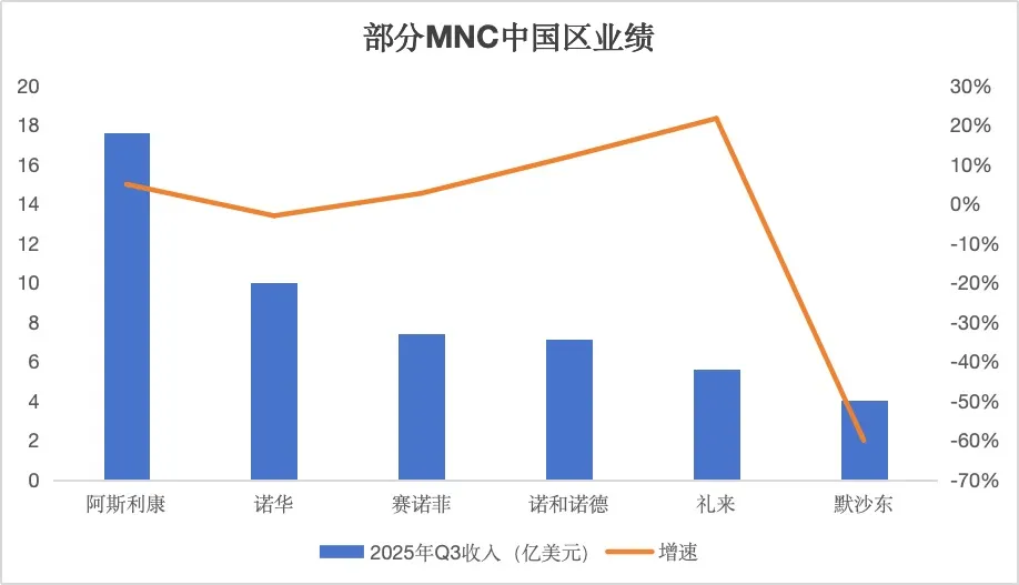 整体来看,2025年第三季度,跨国药企在中国市场的业绩呈现出显著的两极分化态势:默沙东业绩暴跌超60%,诺华也小幅下滑3%;与之相对的,是诺和诺德与礼来两位GLP-1“双姝”的双位数猛增,前者增长12%,后者高达22%;此外,阿斯利康、罗氏、赛诺菲等MNC依旧维持个位数的稳健增长。