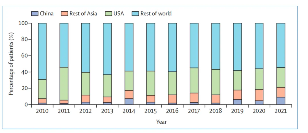该篇文章比较有意思的是提到这些年来亚洲药企的药物申请中,中国病人占比正在日趋增多。如下图所示。这里面还提到了由于桥接研究样本量较小、通常采用非随机设计,并且主要依赖于应答率或药效学比较而非其他指标,因此可能无法充分解决其普适性问题。例如总生存期等终点指标,MRCT 在采用桥接研究而非强制要求额外对照试验来验证安全性和疗效方面展现出灵活的监管策略在前面几十年得到了非常不错的效果。