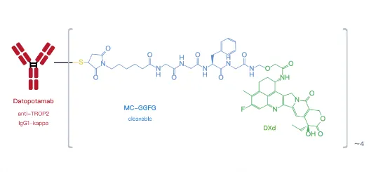 第一三共/阿斯利康的德达博妥单抗更是实现了结构层面的升级。其采用GGFG四肽linker,在血浆中稳定且可于肿瘤内精准释放;毒素部分的Dxd生物活性约为SN-38的10倍,且对TROP2特异性极高,几乎不与TROP1结合;DAR值优化为4,不仅提升了组织穿透力,也显著改善了血浆耐受性。