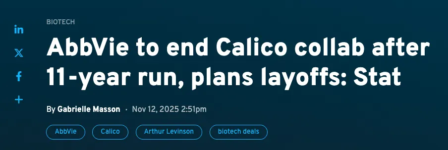 当地时间 11 月 12 日,据外媒报道,艾伯维将终止与 Alphabet 旗下 Calico Labs 长达 11 年的协议。根据艾伯维 2024 年报告,从 2013 年到 2022 年,公司已向该项目投入 17.5 亿美金。