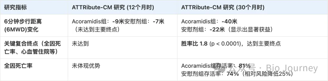 然而,该试验继续进行。到 30 个月时,Acoramidis 在包括全因死亡率、心血管住院、NT-proBNP 和 6MWT 在内的分层主要终点上,取得了高度统计学显著性的胜利。