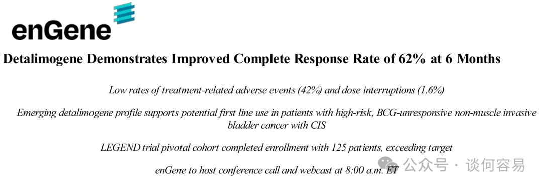 2025 年 11 月 11 日,enGene Holdings 公布了其正在进行的 II 期试验 LEGEND 研究关键队列的初步数据,该试验旨在评估 detalimogene voraplasmid(也称为 detalimogene 或 EG-70)治疗高危、卡介苗(BCG)无应答的非肌层浸润性膀胱癌(NMIBC)伴有原位癌(CIS)患者(无论是否伴有乳头状病变)的疗效和安全性。