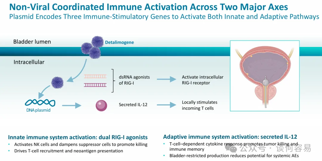 开发的一款非病毒基因疗法,该疗法通过膀胱内灌注给药,以驱动膀胱局部表达先天性(RIG-I激动剂)与适应性(IL-12)免疫调节因子,并重塑肿瘤免疫微环境。