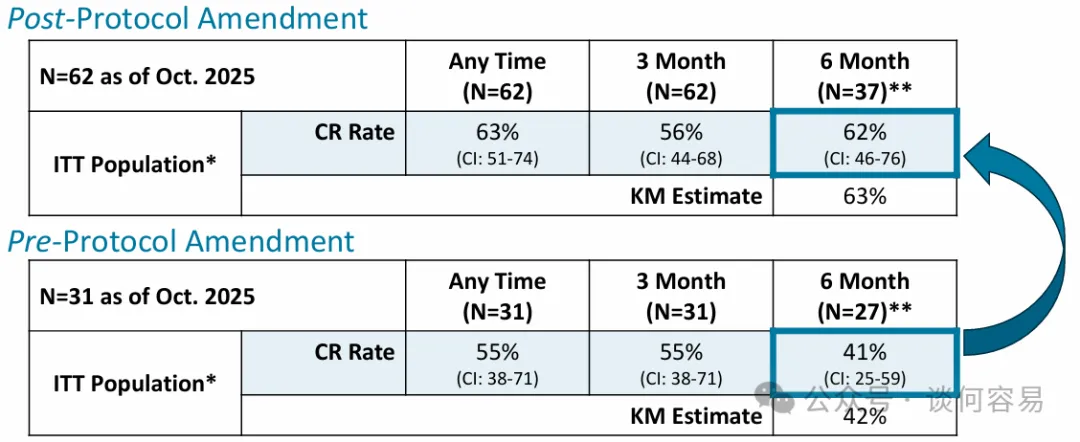 经与 FDA 近期讨论后,关键队列的主要终点将从原定的 12 个月 CR,更改为任何时间点的 CR;其关键次要终点则改为 CR 患者的缓解持续时间(DOR)。此次更新的主要终点与 FDA 近期批准的其他项目保持一致。