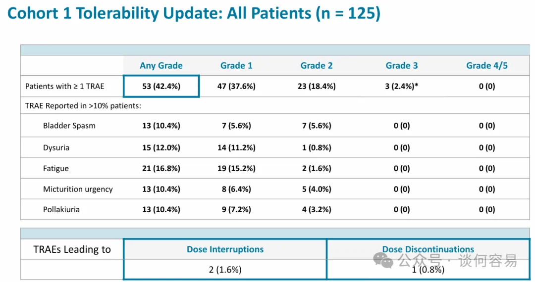 这些患者的数据显示出良好的耐受性特征:任何级别的 TRAE 为 42.4%,仅发生 3 例 3 级 TRAE,1.6% 的患者因 TREA