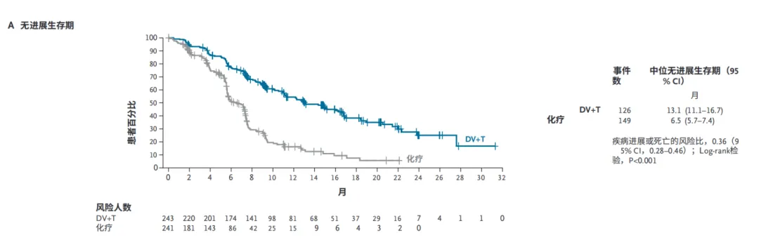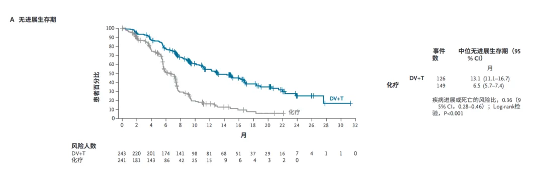 在PFS层面,维迪西妥单抗+特瑞普利单抗治疗组画出了一条非常漂亮的曲线,mPFS达到13.1个月,显著优于对照组的6.5个月,mPFS相比含化疗实现了翻倍,0.36的HR也展出这一项数据的统计学显著性;