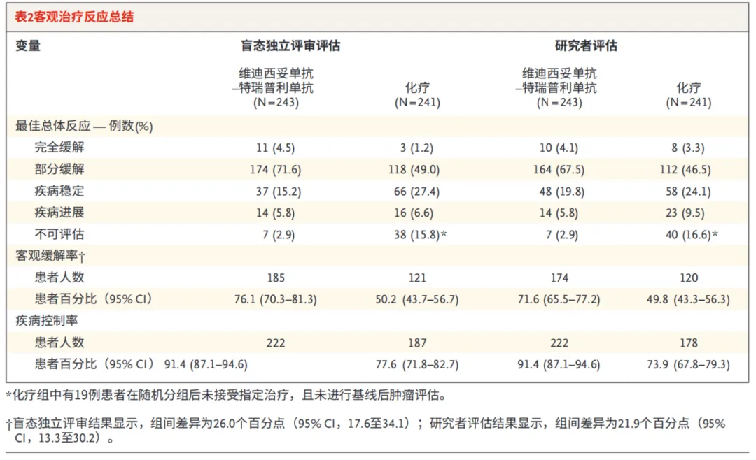 不仅在研究主要双终点中表现出色,维迪西妥单抗+特瑞普利单抗组合的ORR、DCR也同样过硬。治疗组76.1%的ORR远超对照组的50.2%,治疗组DCR则是高达91.4%,远超对照组的77.6%。