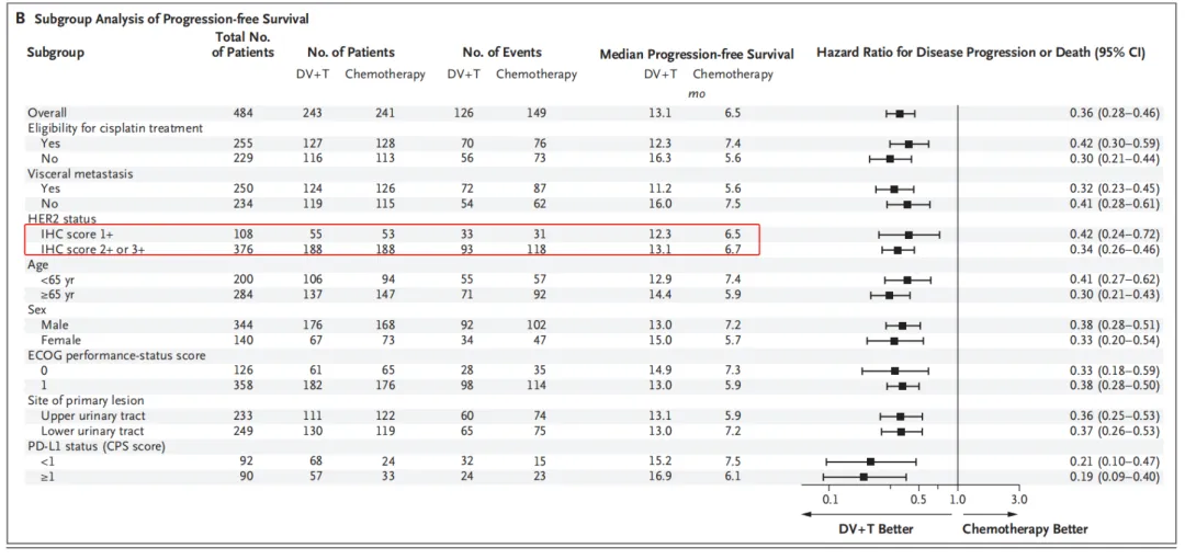 值得注意的是,在所有预设亚组中,mPFS、mOS获益普遍一致,无论患者内脏转移状态如何、是否使用顺铂、PD-L1的表达水平高低、HER2表达水平高低等,这代表维迪西妥单抗+特瑞普利单抗这一组合巨大的疗效与市场潜力,未来有望写入指南作为一线治疗UC全人群推荐。