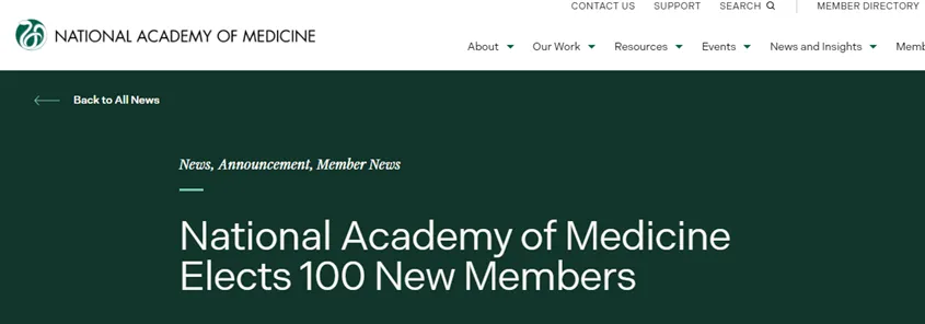 最近,美国国家医学院(National Academy of Medicine, NAM)在2025年度会议上宣布,本次共选举产生90名常规成员和10名国际成员。当选该学院成员被视为健康与医学领域的最高荣誉之一,以表彰那些在专业领域取得杰出成就并致力于服务社会的个人。