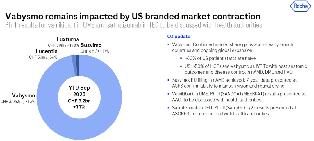 罗氏VEGF/Ang2双抗为最畅销的眼科抗血管增生新药,前三季度销售额39.21亿美元,预计全年超过50亿美元。