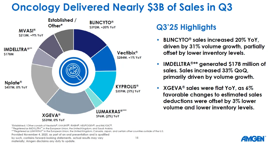 安进CD3/CD19双抗blincyto前三季度销售额11.46亿美元,预计全年超过15亿美元。目前在积极探索自免适应症。实体瘤DLL3/CD3双抗前三季度销售额3.93亿美元,处于快速放量阶段,预计全年超过6亿美元。