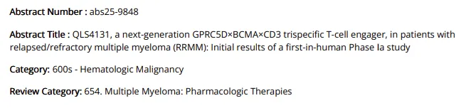 齐鲁制药将在本次会议上首次公布下一代 GPRC5D×BCMA×CD3 三抗 QLS4131 在复发或难治性多发性骨髓瘤(RRMM)患者中首次人体试验的初步研究结果。