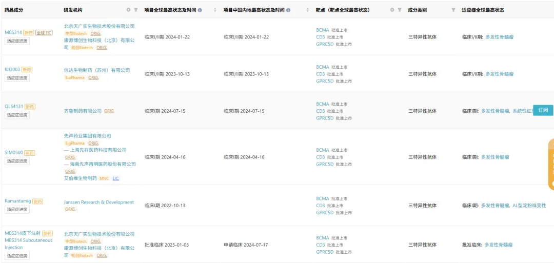Insight 数据库显示,全球在研的 GPRC5D×BCMA×CD3 三抗共有 13 款,6 款已经进入临床阶段,分别来自天广实(MBS314)、信达(IBI3003)、齐鲁(QLS4131)、先声药业/艾伯维(SIM0500)、强生(JNJ-79635322)。