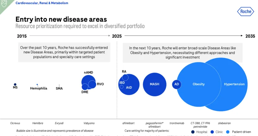 今年研发日上,罗氏明确表示,过去十年,公司已经成功在多发性硬化症、血友病等新疾病领域占有一席之地,下个十年将通过大量投资并凭借差异化策略,进入阿尔茨海默症、高血压、肥胖等大型疾病领域。