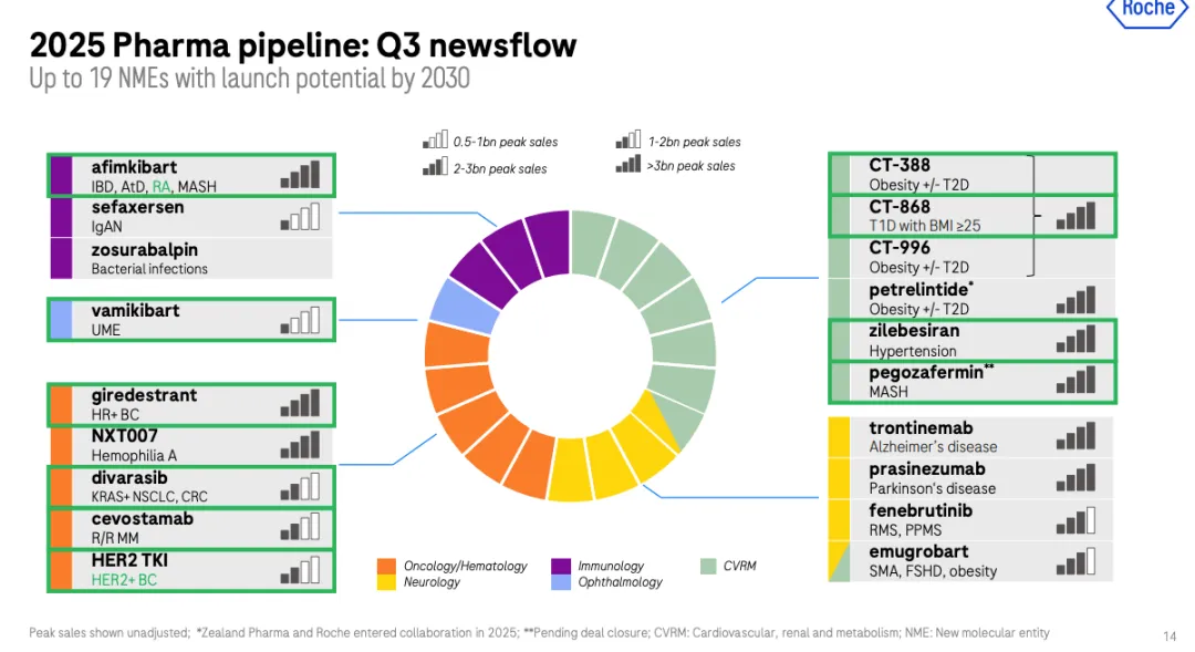 罗氏在三季度报中披露,计划在 2030 年前推出 19 款新分子实体,其中 16 款具备重磅炸弹潜力。而这些增长引擎有 2 款销售峰值预计在 20 亿美元至 30 亿美元之间,9 款销售峰值将突破 30 亿美元,大多来自肥胖、高血压、脂肪肝炎、阿尔茨海默病等慢病领域。