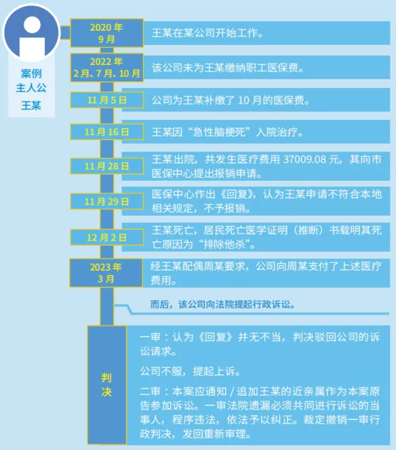 经王某配偶周某要求,公司于2023年3月向周某支付了上述医疗费用;而后,该公司向法院提起行政诉讼,要求撤销医保中心作出的《回复》,责令医保中心对王某于2022年11月16日至2022年11月28日因病住院期间的医疗费用进行审核、报销,并按规定支付给公司。