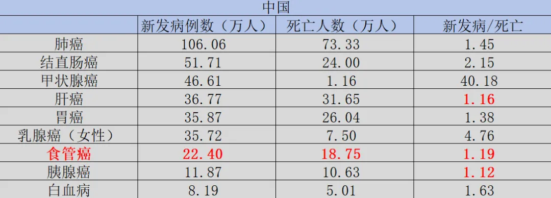 由于饮食习惯的差异,美国食管癌发病率并不高,甚至无法排进癌症发病率的前十位。可与美国形成鲜明对比的是,中国食管癌却存在巨大的临床未满足需求。根据国家癌症中心2022年公开的数据,中国每年新增食管癌患者22.4万人,每年死亡患者18.75万人,新发病患者与死亡患者的比例低至1.19,仅高于“癌王”胰腺癌与肝癌。