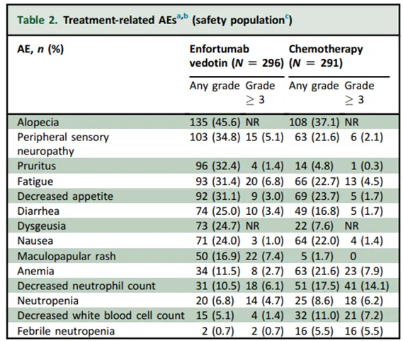 PADCEV临床上常见的血液毒性外的不良反应主要集中在皮肤和眼部,皮肤毒性包括脱发、瘙痒、斑丘疹等,眼部毒性包括干眼、角膜炎、视力模糊、溢泪和角膜缘干细胞功能不全等[2]。此外,它还可能导致重度和致死性皮肤不良反应,包括史蒂文斯-约翰逊综合征(Stevens-Johnson Syndrome,SJS)和中毒性表皮坏死松解症(Toxic Epidermal Necrolysis,TEN),因此说明书被FDA加上了黑框警告。