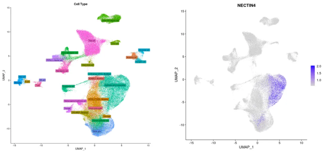 图3 DISCO数据库中眼部细胞Nectin-4表达情况