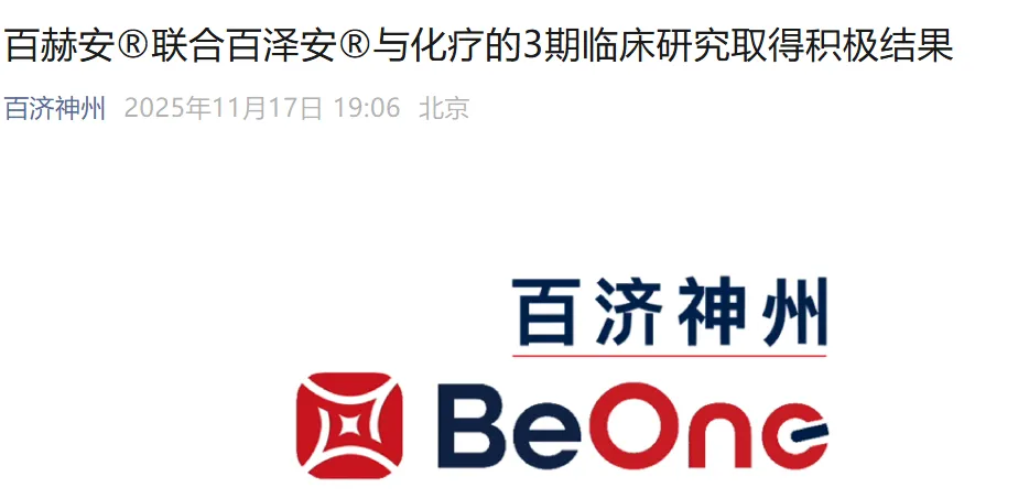11月17日,百济神州宣布,其3期临床研究HERIZON-GEA-01取得积极结果。该研究旨在评估HER2靶向双特异性抗体泽尼达妥单抗(百赫安®)单药或联合PD-1抑制剂替雷利珠单抗(百泽安®)与化疗,作为HER2阳性局部晚期或转移性胃食管腺癌一线治疗的疗效和安全性。研究结果显示,与标准治疗曲妥珠单抗联合化疗相比,两个试验组在无进展生存期和总生存期方面均显示出具有临床意义且统计学显著的改善。