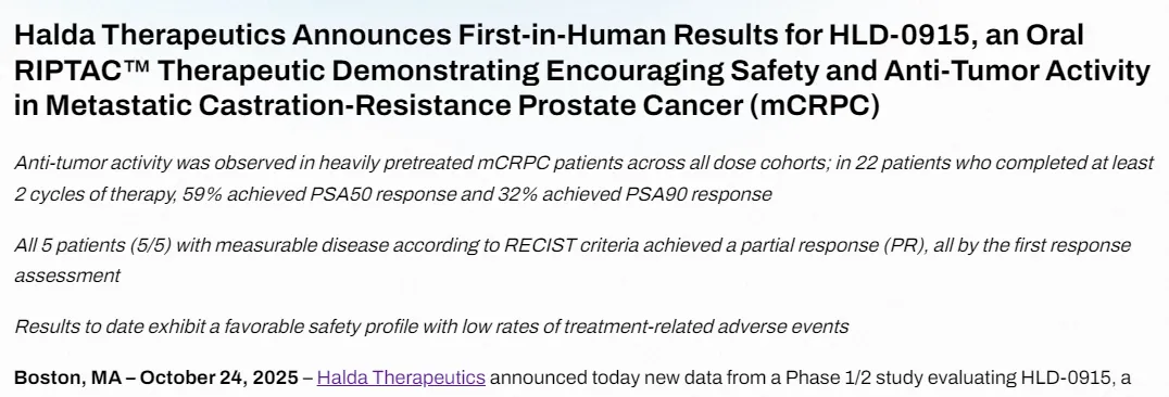Halda拥有专有的调控诱导接近靶向嵌合体(RIPTAC)平台,用于开发针对多种实体瘤的口服靶向疗法。其中,主导候选药物HLD-0915目前正处于Ⅰ/Ⅱ期临床研究阶段,旨在克服转移性去势抵抗性前列腺癌(mCRPC)治疗中的耐药性。