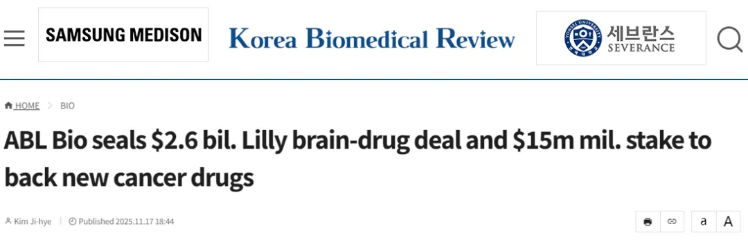 毫无疑问,前沿技术平台正在成为制药巨头争相收购和合作的“香饽饽”。11月17日,礼来与韩国药企ABL Bio也达成一项交易。礼来将向ABL Bio支付4000万美元的首付项,以及最高达25.6亿美元的生物技术相关款项,以获得后者Grobody-B平台的使用权。此外,礼来还将对ABL Bio进行一项价值约1500万美元的股权投资。