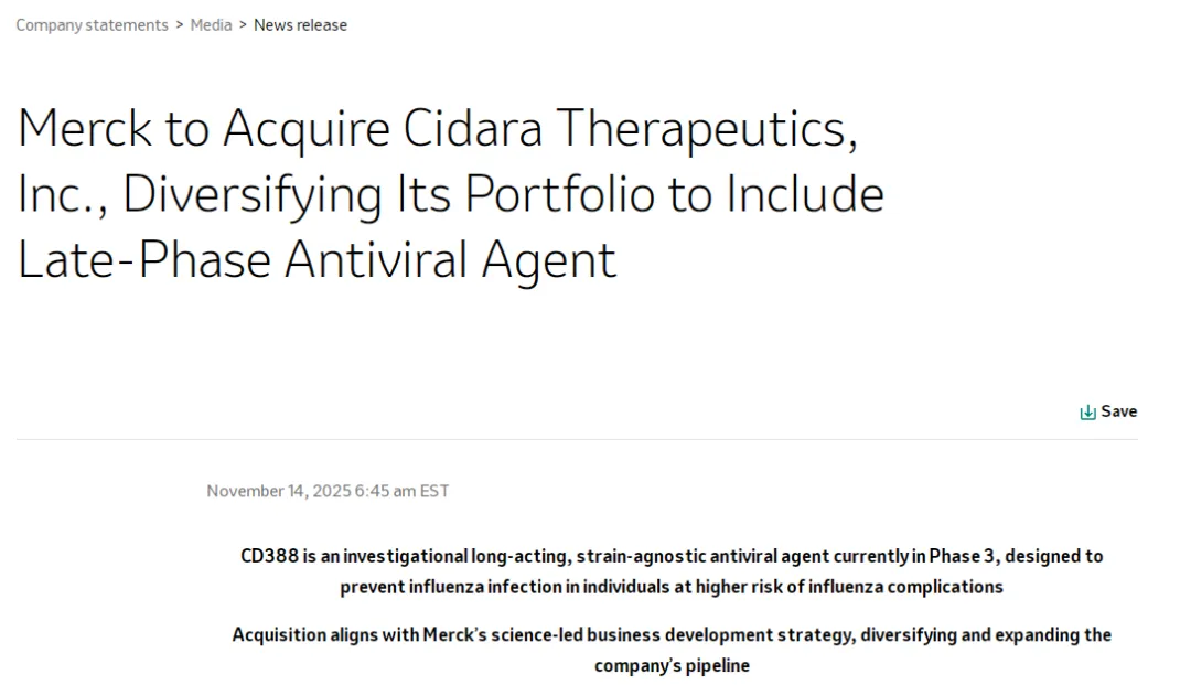 无独有偶,11月14日,默沙东也宣布将以92亿美元收购致力于开发药物-Fc偶联物(DFC)疗法的生物技术公司Cidara Therapeutics。这次收购被视为默沙东在应对“后K药时代”增长压力的重要战略举措。