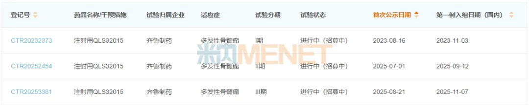 据齐鲁制药官微资料显示,注射用QLS32015是一款GPRC5D/CD3双特异性抗体,公司在2023年4月首次提交1类新药临床申请,同年6月获批适应症为多发性骨髓瘤,今年4月公司再次提交临床申请,6月获批适应症为联合泊马度胺,或联合达雷妥尤单抗,或联合泊马度胺和达雷妥尤单抗,或联合硼替佐米和来那度胺治疗多发性骨髓瘤。11月初,注射用QLS32015的多发性骨髓瘤III期临床首例受试者成功入组。