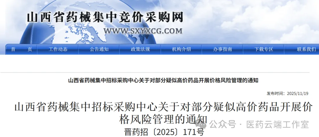 11月19日,山西省药械集中招标采购中心发出《关于对部分疑似高价药品开展价格风险管理的通知》,通知显示,经比对平台同品种药品挂网价格后,现对部分疑似高价药品开展价格风险管理工作,相关企业须在2025年11月25日前将企业药品挂网价格调整至合理水平。