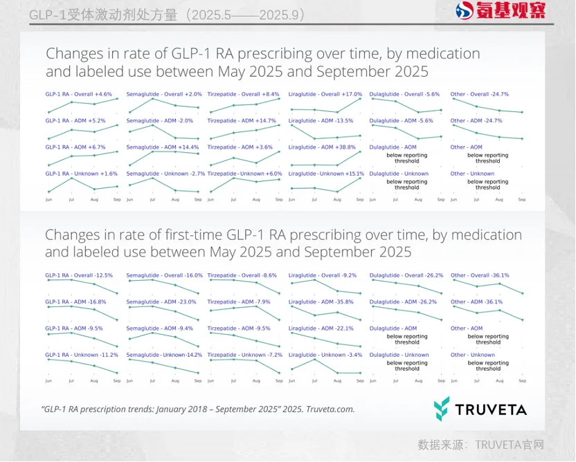 Tirzepatide的环比增速跌至个位数,Semaglutide单季度销售额转为负增长;第三方数据也显示,美国GLP-1药物9月份的处方量出现两位数下滑,这是自今年6月以来首次出现此类情况。