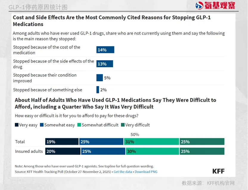 KFF统计结果显示:约14%曾使用过GLP-1类药物的成年人因费用问题停止用药,这一比例与因副作用停药的13%相近,仅有5%的患者因病情改善而停药。