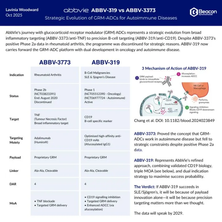 但是2025年8月,艾伯维带来了一款新的糖皮质激素为载荷的ADC。其主要靶向CD19,但是治疗的不是自免,而是B细胞淋巴瘤。其旨在降低糖皮质激素相关毒性,同时具有三种不同的作用机制(MOA)以提高治疗效果:(1)抗体介导递送糖皮质激素受体调节剂(GRM)有效载荷以激活细胞凋亡;(2)抑制CD19信号通路;(3)通过抗体骨架的去岩藻糖基化增强Fc片段介导的效应功能。