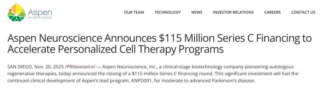 2025年11月20日,专注于自体再生疗法的临床阶段生物技术公司Aspen Neuroscience宣布完成1.15亿美元的C轮融资。这笔巨额投资将用于推进Aspen的主导项目ANPD001的临床开发,该项目旨在治疗中度至重度帕金森病。
