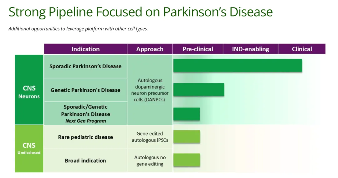 ANPD001是一种在研细胞疗法,可作为PD的自体神经元替代物。该疗法的制造是基于Aspen公司的个体化三步制造策略:首先从患者身上提取自身皮肤细胞的少量样本,然后将它们重编程为诱导多能干细胞(iPSC),再分化为多巴胺神经元前体细胞(DANPC)。然后,医护人员通过手术将DANPC提供给患者,以替代他们因疾病而丢失或受损的神经元细胞。在每个制造阶段,都会用到Aspen公司专有的基于人工智能的基因组学测试来评估每个患者的细胞质量。