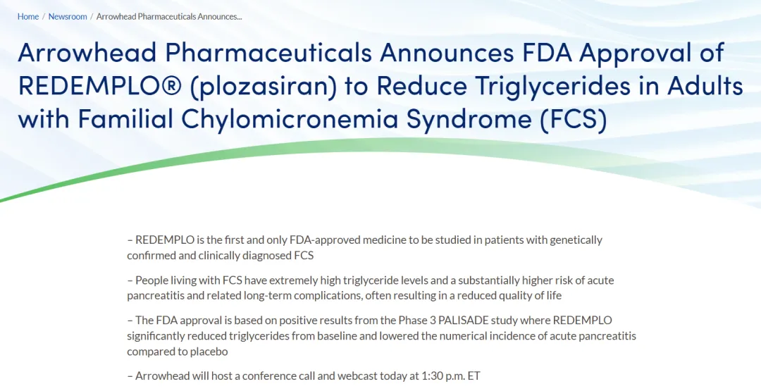 2025年11月18日,Arrowhead Pharmaceuticals宣布FDA已批准其siRNA药物REDEMPLO(plozasiran)上市,作为饮食疗法的辅助手段,用于降低家族性乳糜微粒血症 (FCS) 成人患者的甘油三酯水平。根据新闻稿 ,REDEMPLO是首款也是目前唯一一款获得 FDA 批准用于治疗FCS的siRNA药物,患者可在家中自行给药,只需每三个月进行一次简单的皮下注射即可。